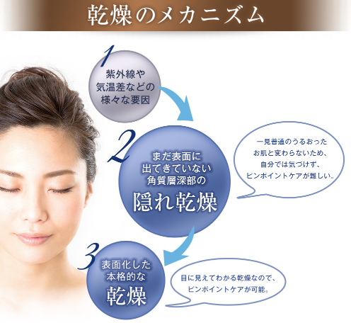 肌の表面にまだ出てきていない角質層深部の隠れ乾燥は、一見普通の潤ったお肌と変わらないため自分では気づけず、ピンポイントケアが難しいのです。